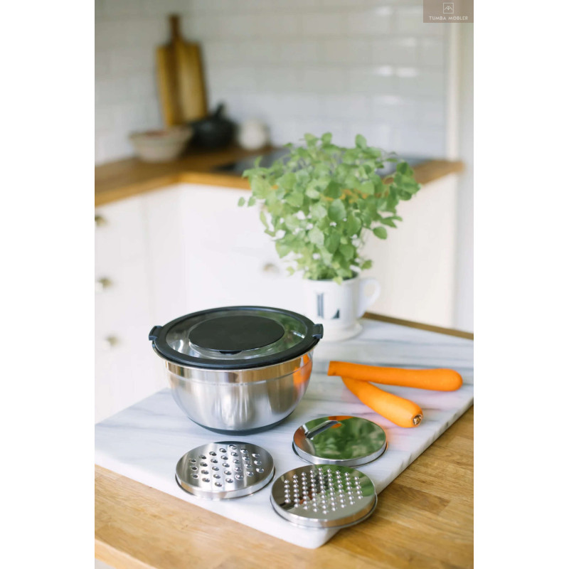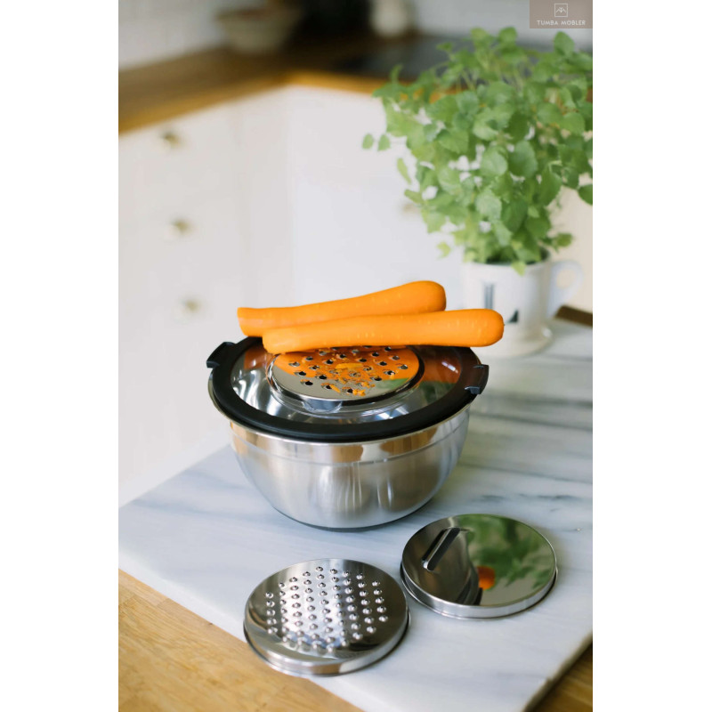 Med bunken Betje kan du enkelt riva såväl ost som grönsaker direkt ner i bunken. Skålen har tre olika rivytor och dessutom ett tätslutande lock för smidig förvaring.