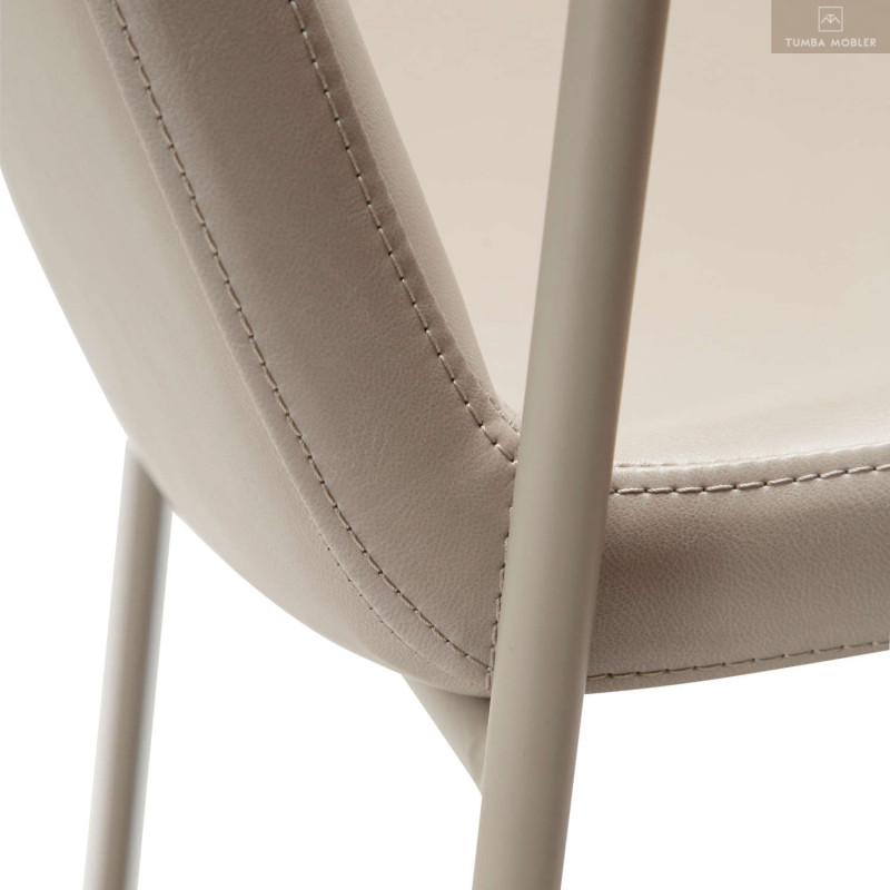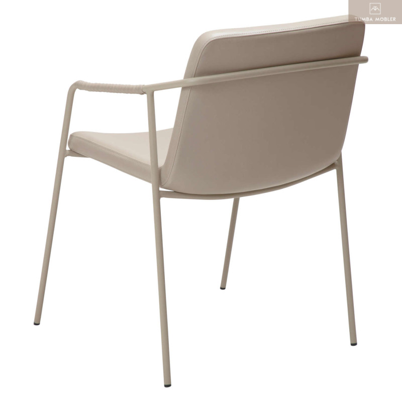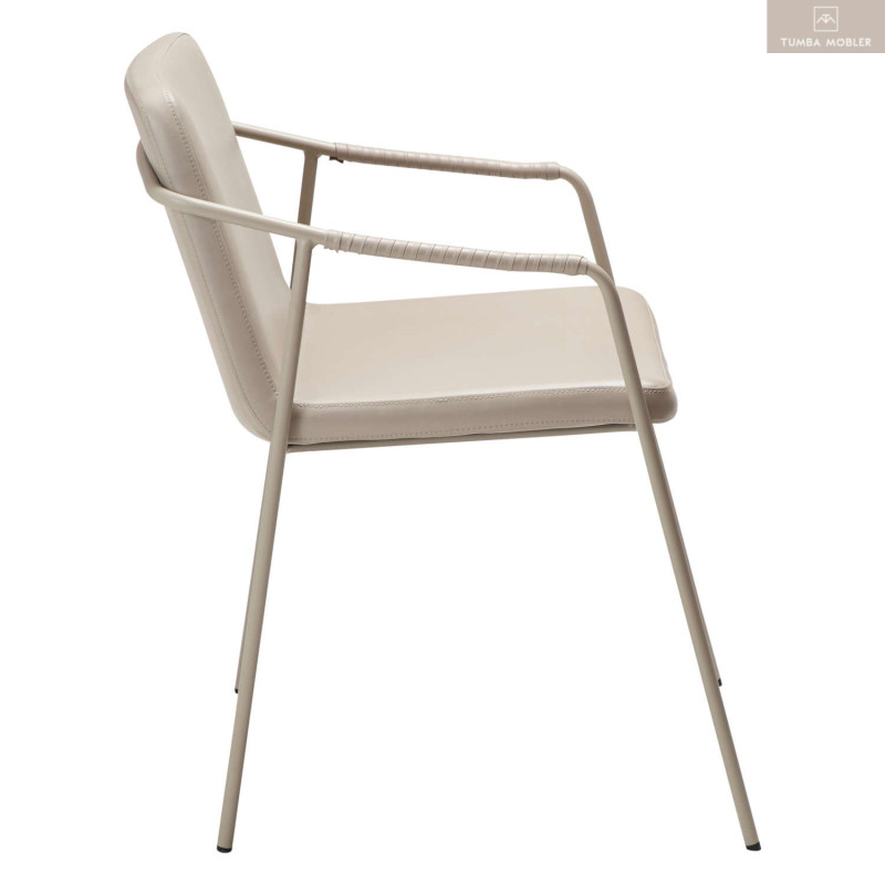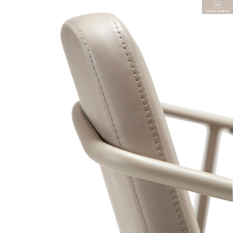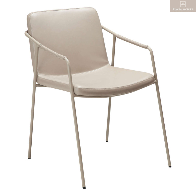 BOTO-karmstol är en klassisk design av By Georgsen. De tunna metallbenen som fortsätter in i armstöden sveper sig runt stolsryggen och sitsen har en mjuk klädd rygg och sits. Det konstgjorda lädret som lindas runt armstöden är en dekorativ detalj som lyfter designen till nästa nivå. BOTO-kollektionen består av stolar, bar- och diskpallar och fåtöljer.