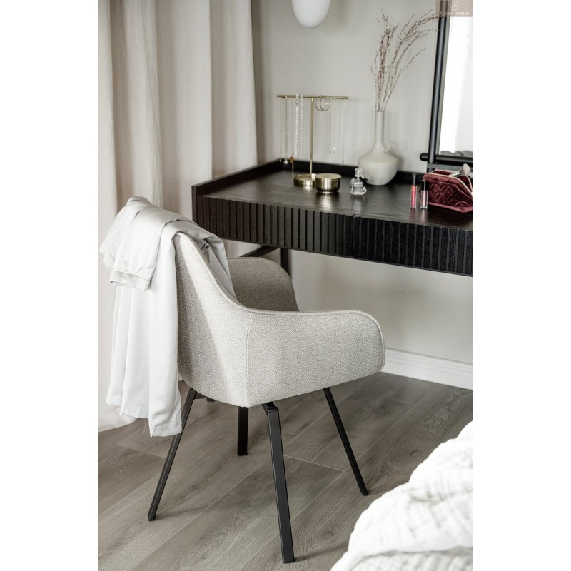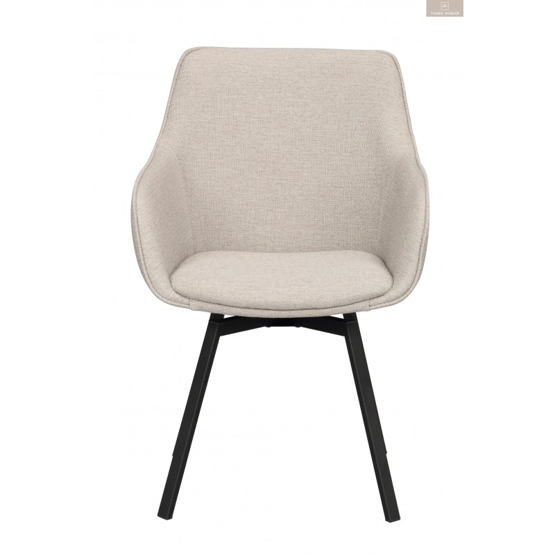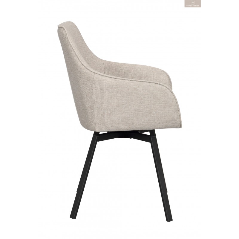 Alison karmstol i beige tyg har precis som populära Alison stol ett snurrbart underrede i 360 grader. Den kupade stoppade sitsen och de höga armstöden gör stolen bekväm och ombonad att sitta i. Träet inuti sitsen består av 100% FSC-certifierat trä och benen består av svart pulverlackad metall.