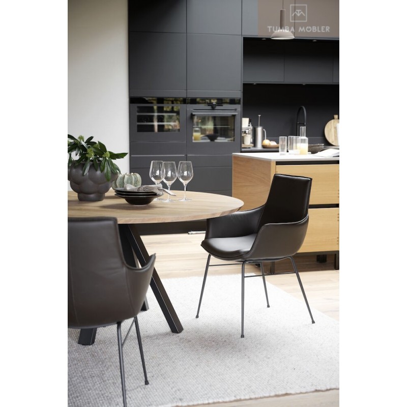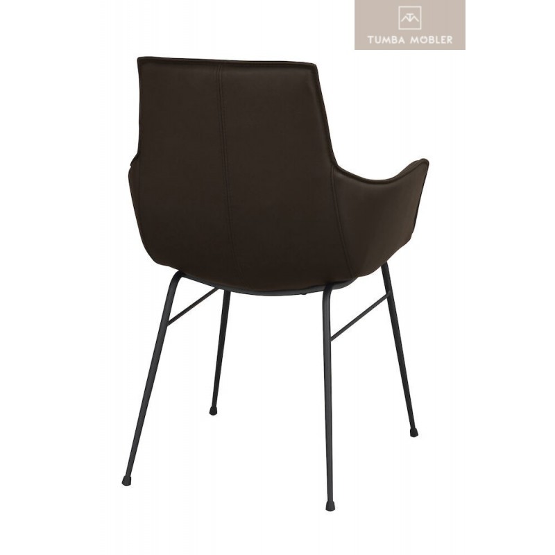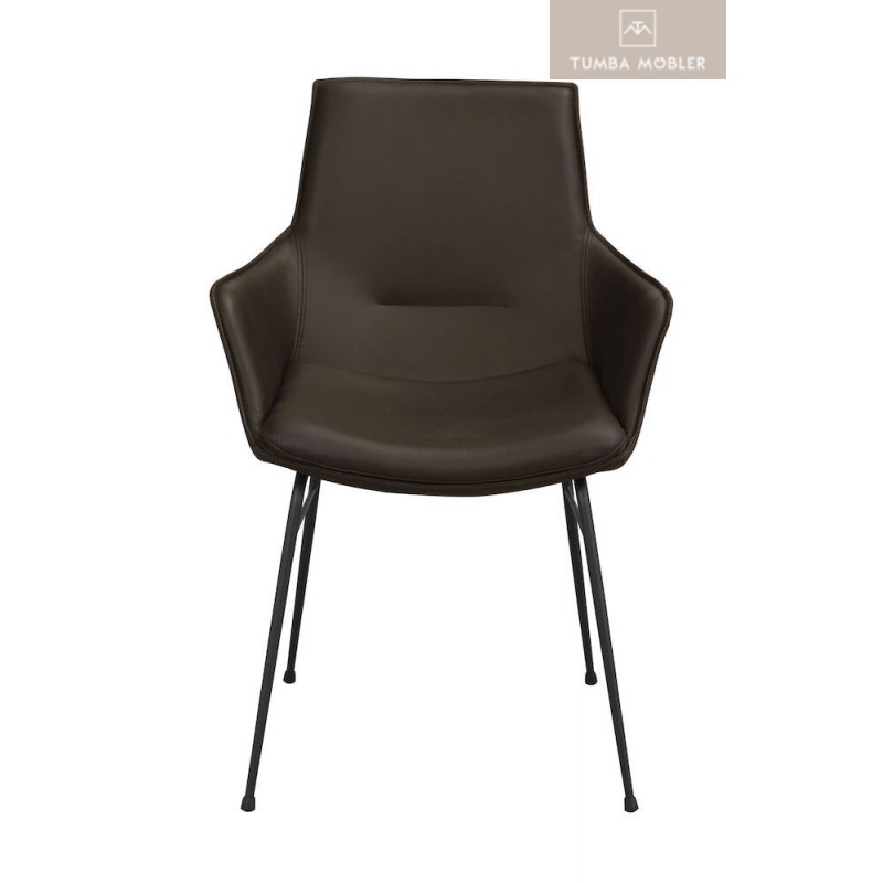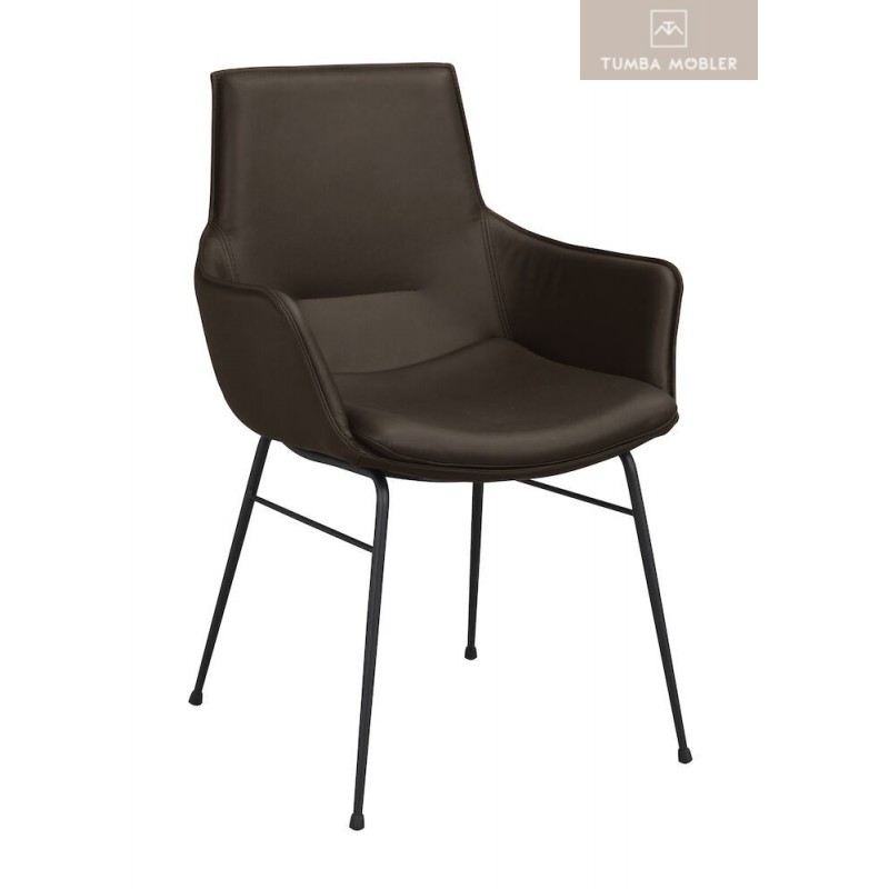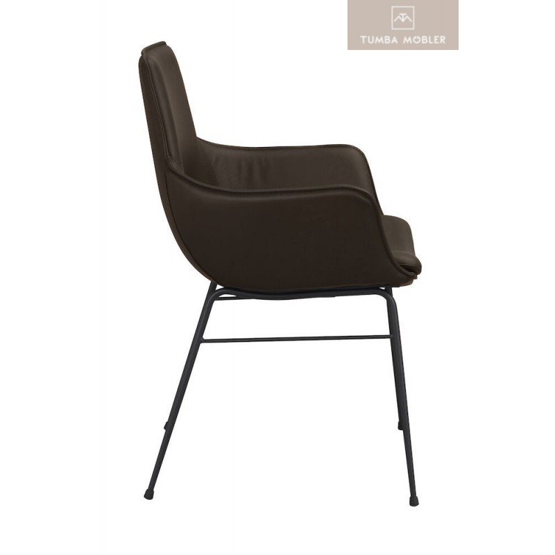 Lowell karmstol i brunt äkta läder med fast underrede i svart pulverlackad metall är en möbel med högt designvärde.