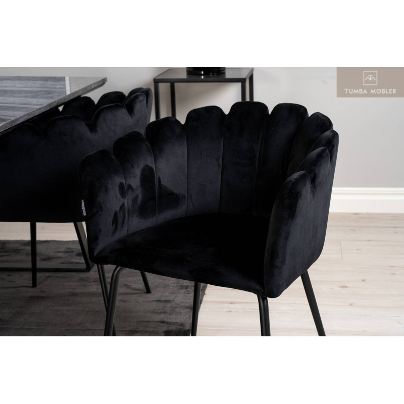 Limhamn matstol är en modern favorit i många hushåll. Den har en inbjudande design med dekorativ snäckformad rygg med dekorsömmar och en rund sits i gult sammetstyg.