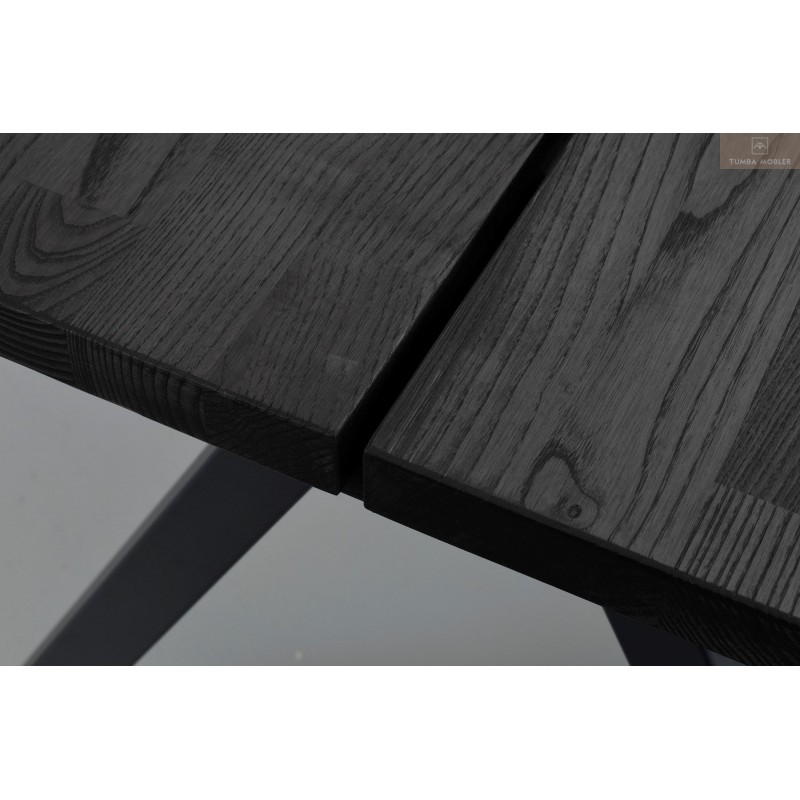 Carradale matbord med tvådelad massiv bordsskiva i svartlackad ask och V-ben i svart pulverlackad metall. Bordsskivan kan kompletteras med 1 eller 2 tilläggsskivor à 50 cm vilket kan göra bordet upp till 320 cm långt. Matbordet ingår i den flexibla Carradale-serien där du kan utforma bordet som du vill ha det.