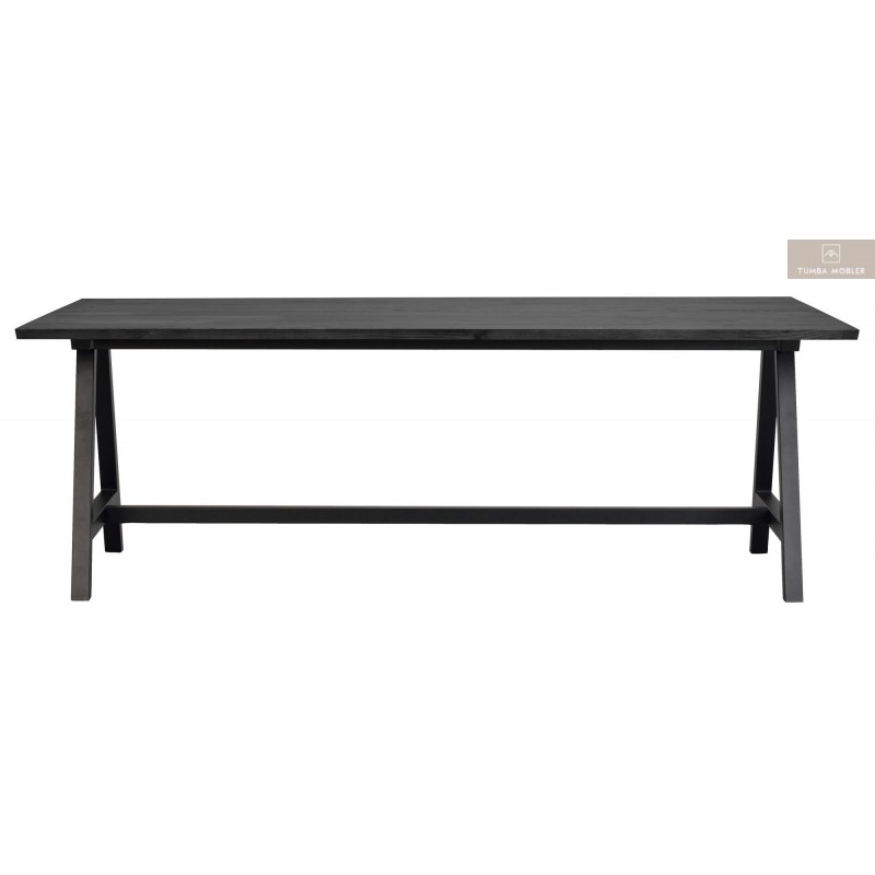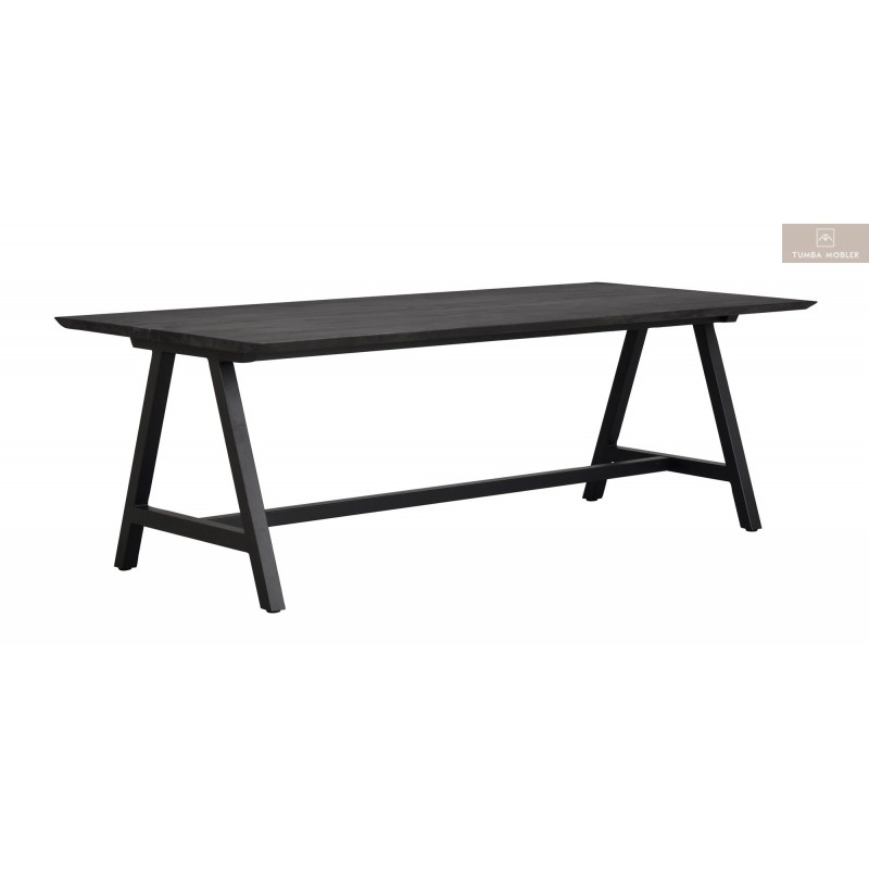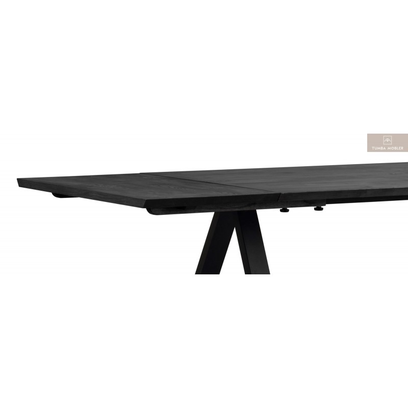 Carradale matbord med tvådelad massiv bordsskiva i svartlackad ask och A-ben i svart pulverlackad metall. Bordsskivan kan kompletteras med 1 eller 2 tilläggsskivor à 50 cm vilket kan göra bordet upp till 320 cm långt. Matbordet ingår i den flexibla Carradale-serien där du kan utforma bordet som du vill ha det.