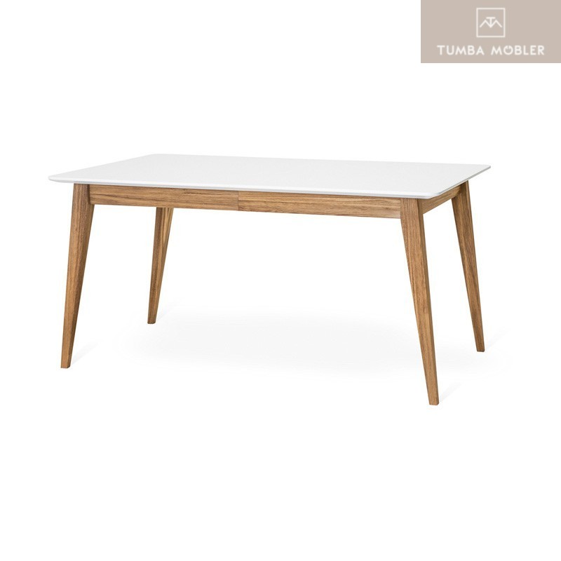 Mood matbord L 150 B 95 H 75 cm med Butterfly ilägg. Bordsskiva i vitlackad MDF med fasad kant. Underrede i massiv oljad ek. Ilägget på hela 50 cm förvaras i bordet och fälls enkelt ut vid behov.