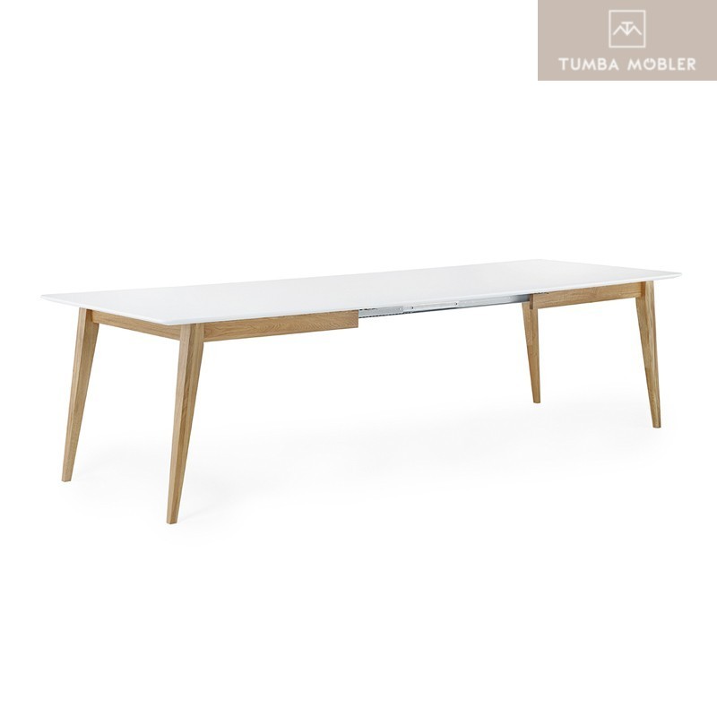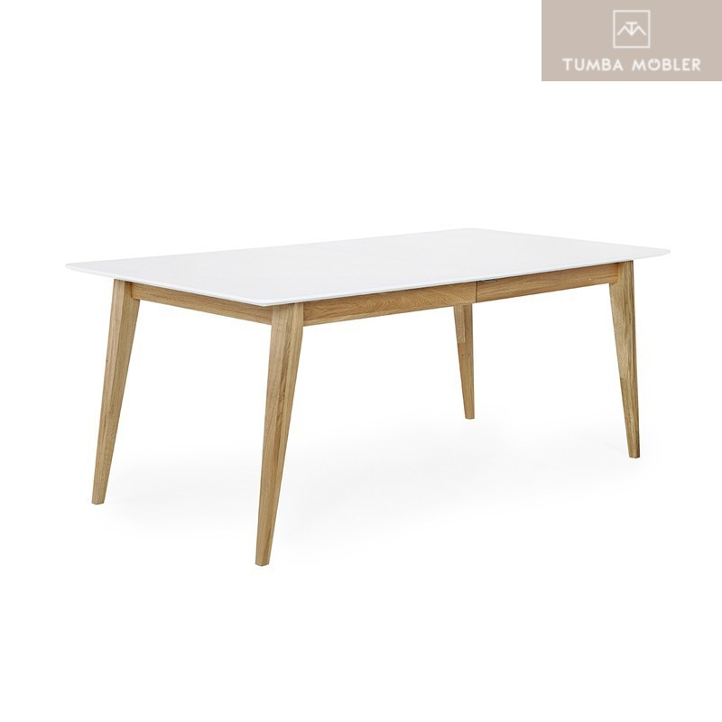 Mood matbord L 190 B 95 H 75 cm med Butterfly ilägg. Bordsskiva i vitlackad MDF med fasad kant. Underrede i massiv oljad ek. Ilägget på hela 95 cm förvaras i bordet och fälls enkelt ut vid behov. Köp även till unni stödben.