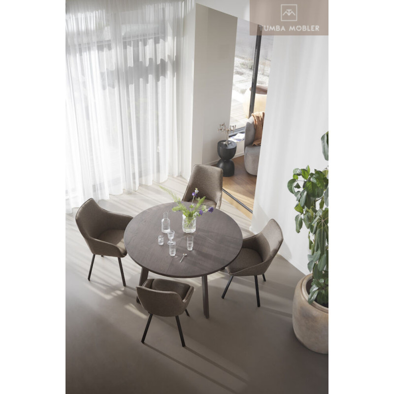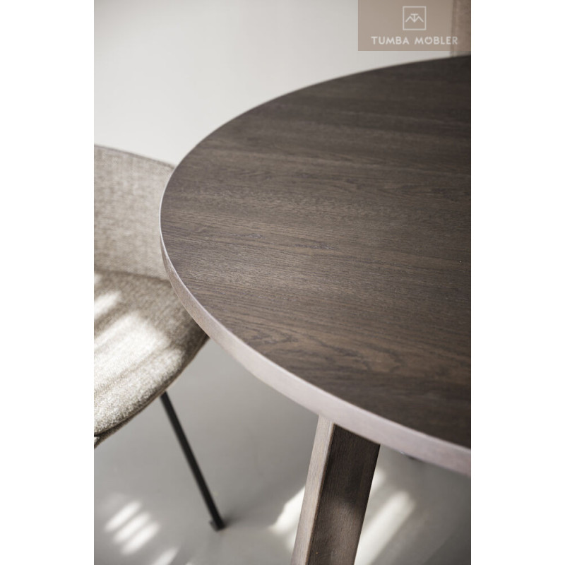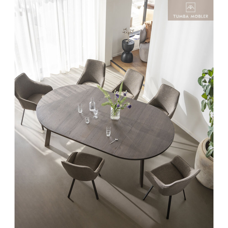Tack vare att trä med synliga kvistar har tagits tillvara i tillverkningen så har varje bord en unik träkänsla. Bordsskivan är semimassiv och det innebär att toppen består av 3 mm massiv ekfaner, vilket gör den mycket hållbar. Högkvalitativt och hållbart – detta är ett matbord att använda och älska i många år framöver. Finns även i brunoljad ek.