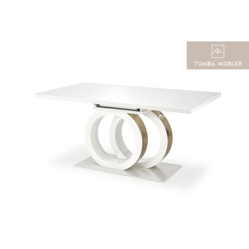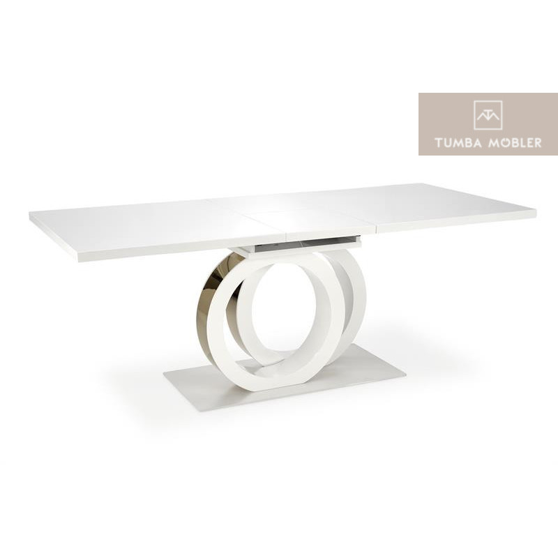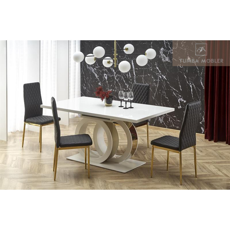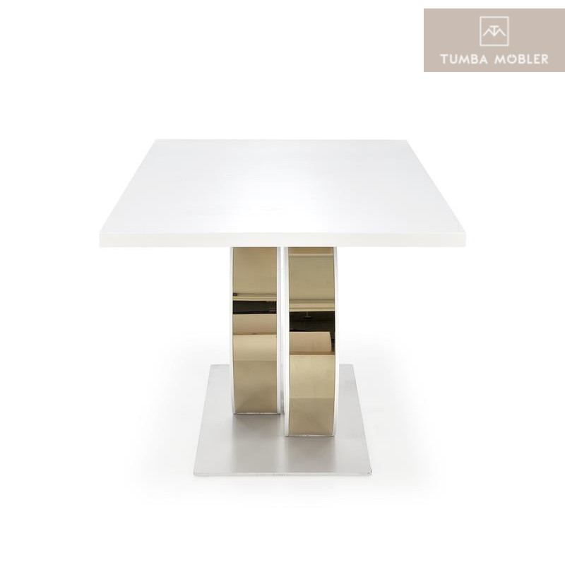 Gallardo matbord är en modernt och elegant matbord som kommer i topp kvalitets material, eleganta ben i vit färg med guld detalj, topp skiva i vit lackerad MDF.