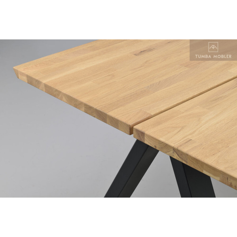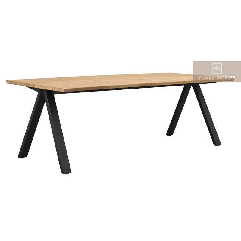 Carradale matbord 220 cm i oljad FSC-certifierad ek. Tvådelad massiv bordsskiva med borstad yta och V-formade ben i svart pulverlackad metall. De eleganta V-benen ger bordet ett luftigt uttryck. Bordsskivan kan kompletteras med 1 eller 2 tilläggsskivor à 50 cm vilket kan göra bordet upp till 320 cm långt.