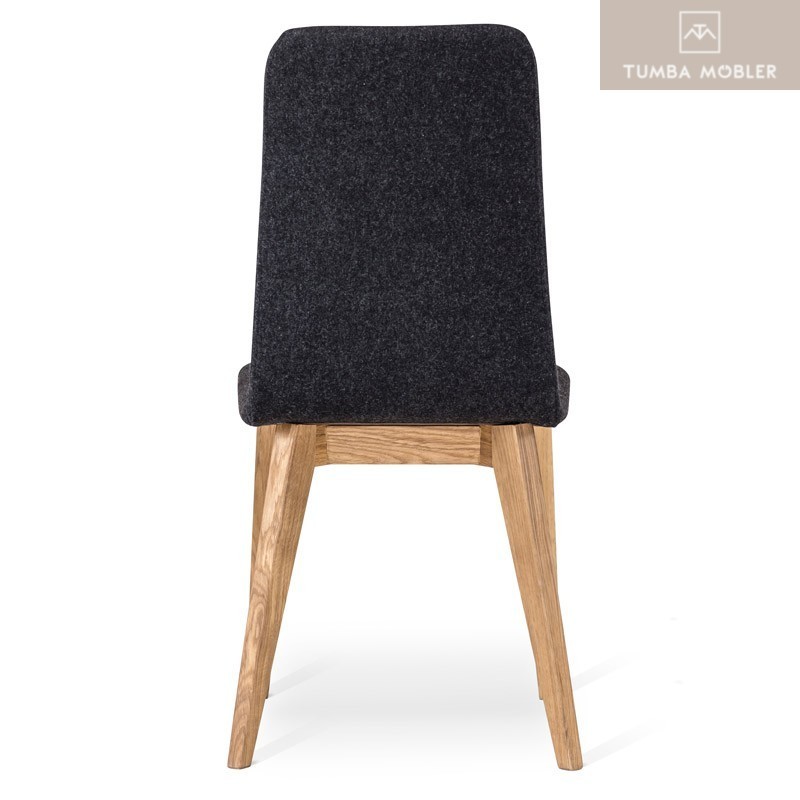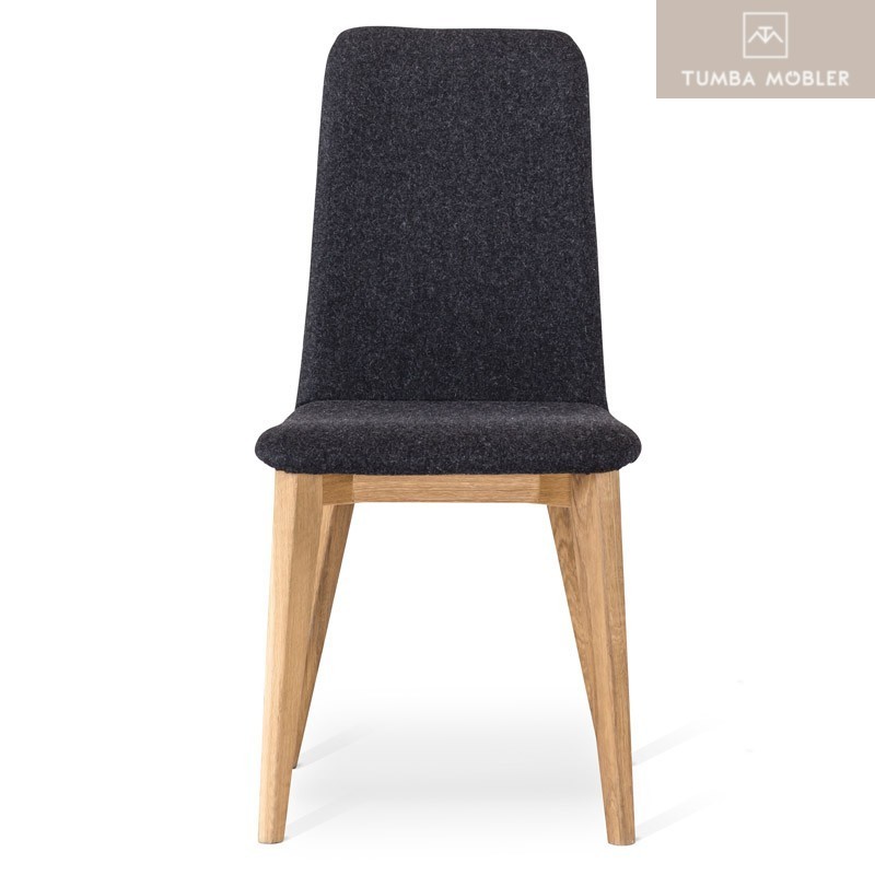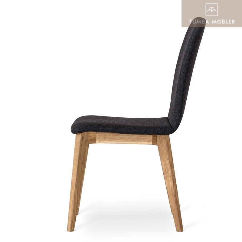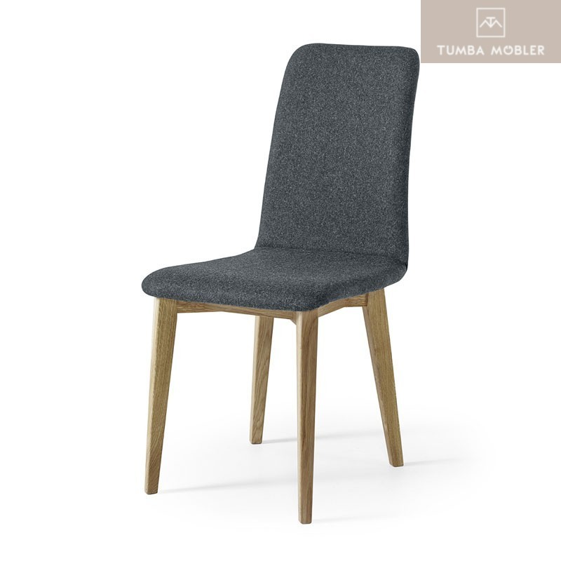 Mood är en elegant och tidlös stol med stoppad sits från Torkelson. Ben i massiv oljad ek och sitsen är helklätt i mörkgrå tyg. Säljs endast 2-pack.