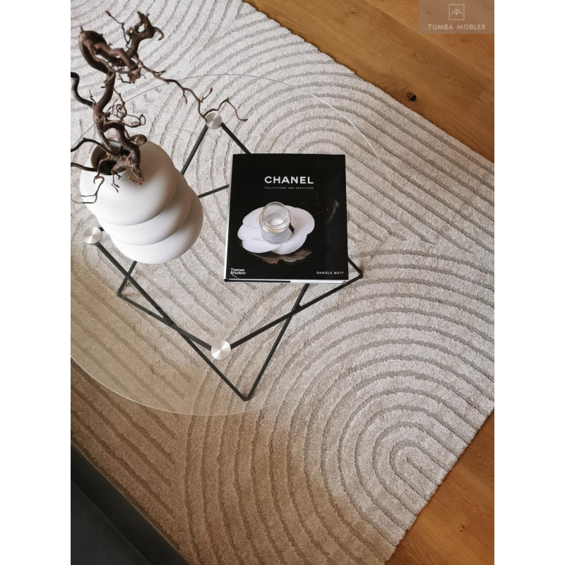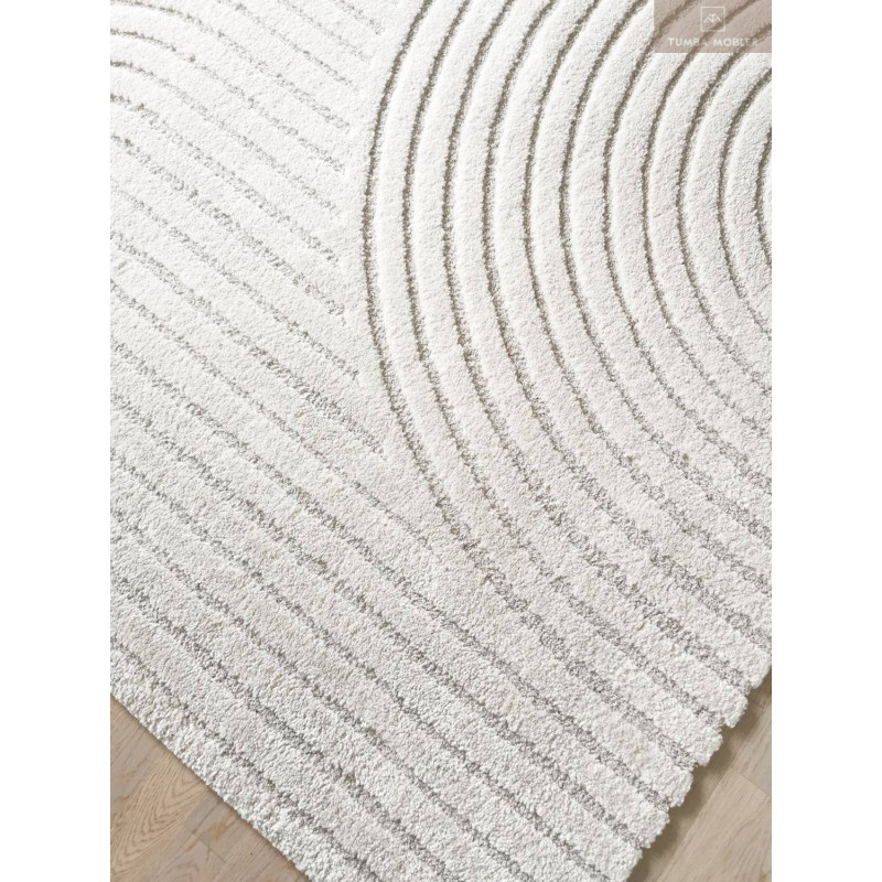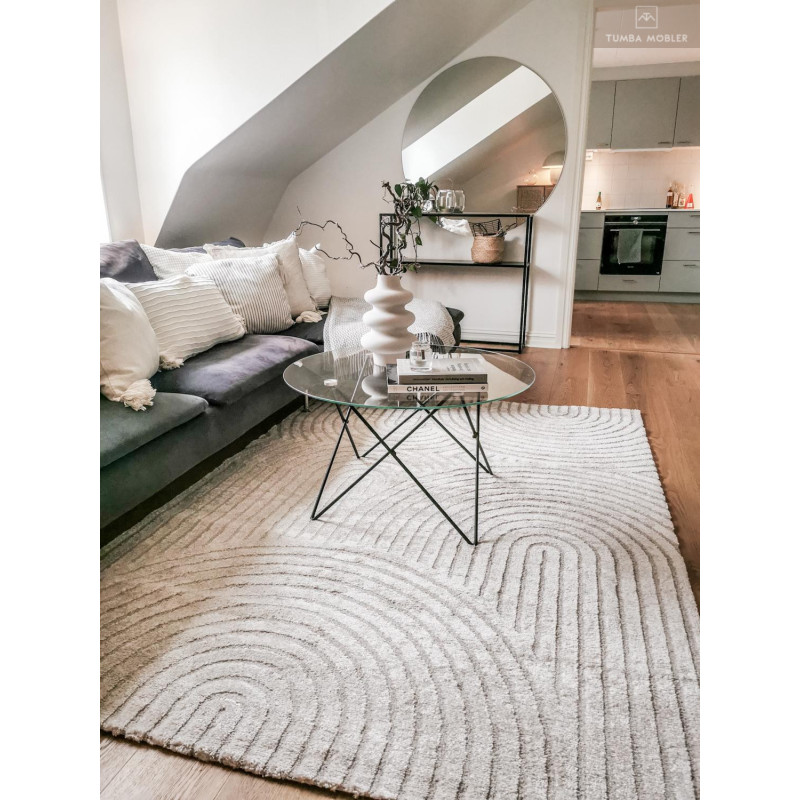 Arcos Natur har en cremevit bottenfärg tillsammans ett mönster i halvcirklar i samma ton. Mönstret ger ett lugnt och behagligt intryck i en lätt glans. Mattan är vävd med high/low-effekt, vilket innebär att mattan har olika lugghöjd som gör mönstret mer framträdande och effektfullt.