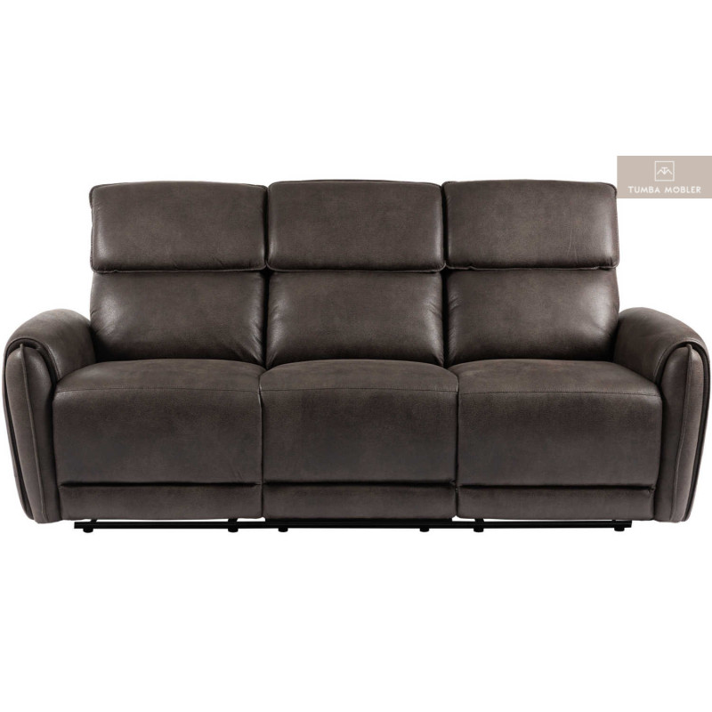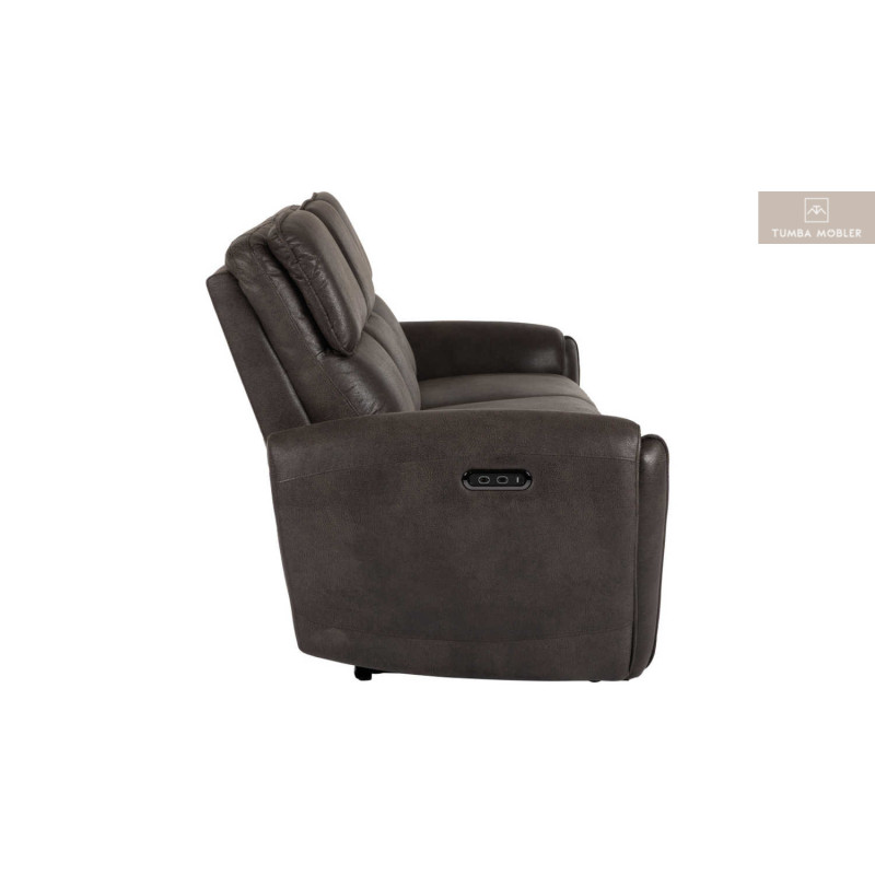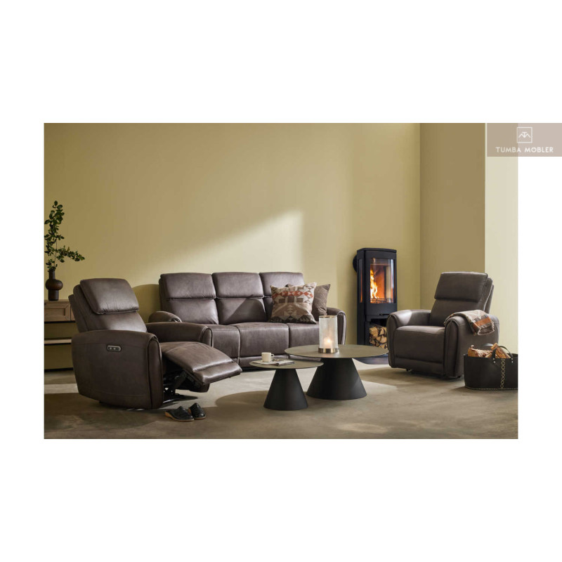 Alice är en elegant recliner soffa i brunt tyg med elektrisk mekanism.